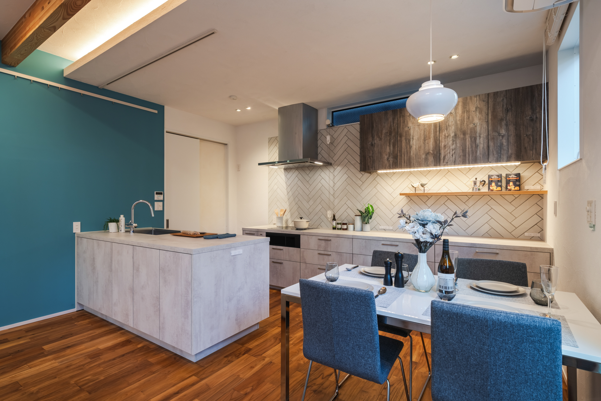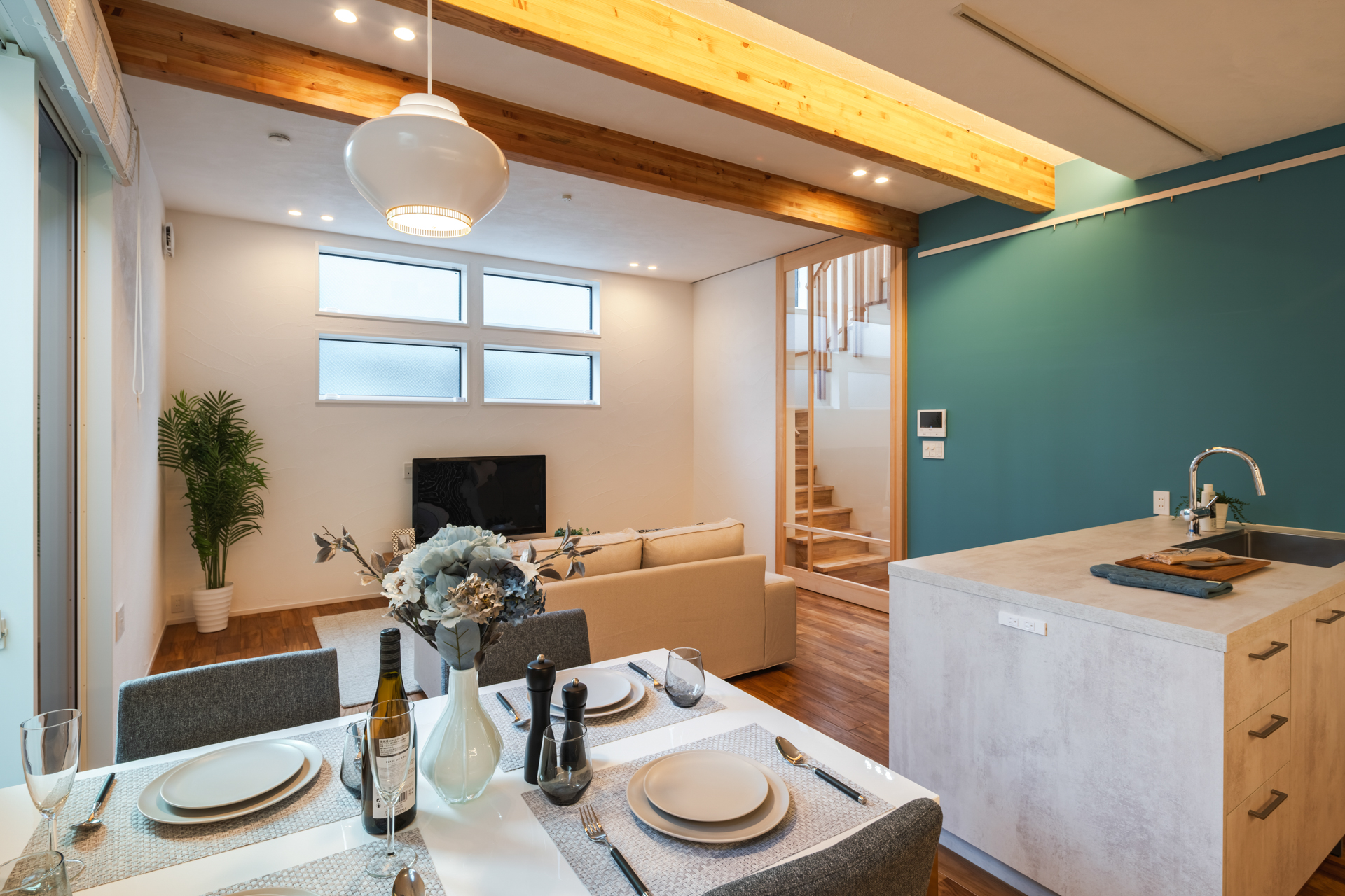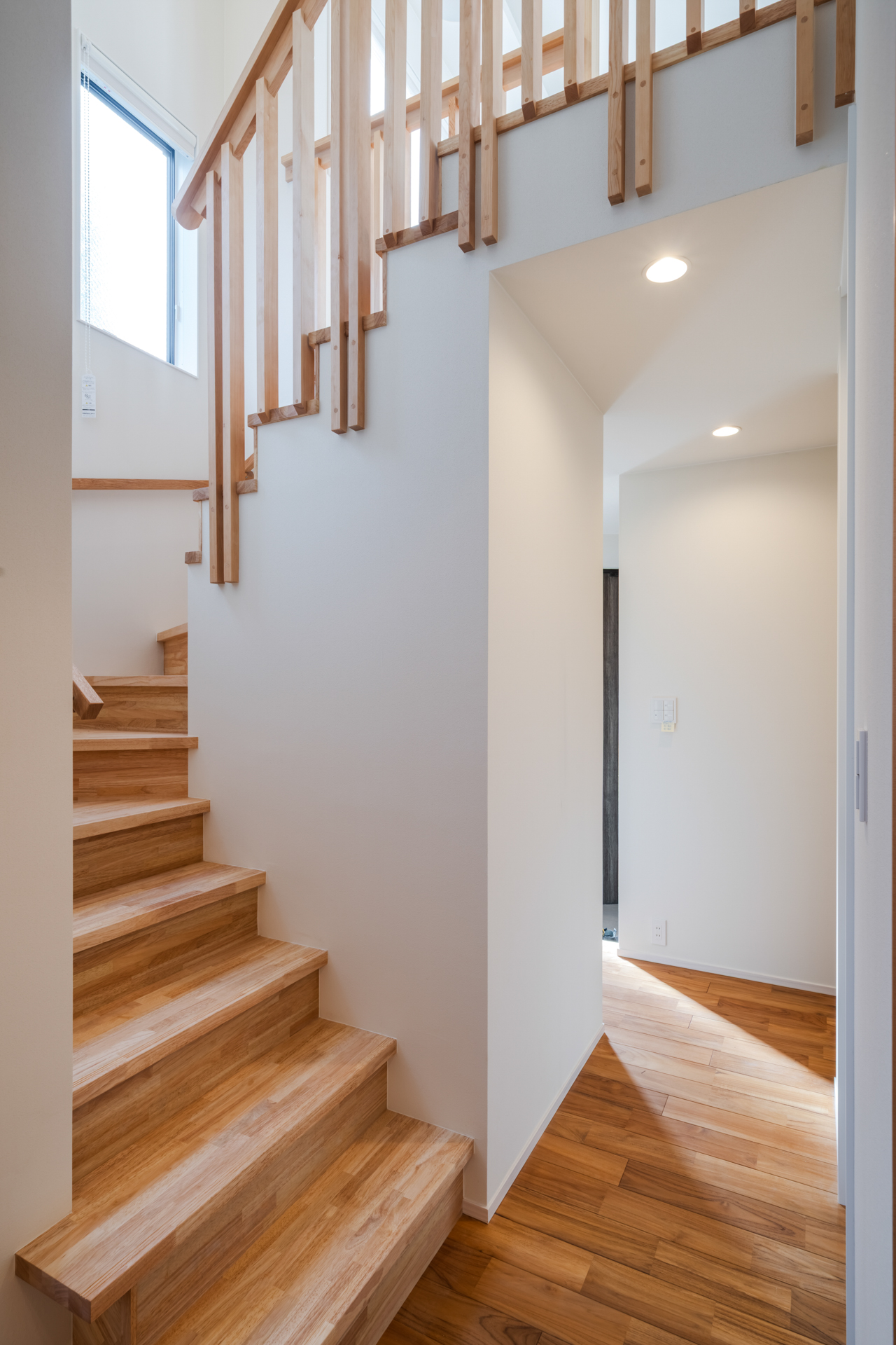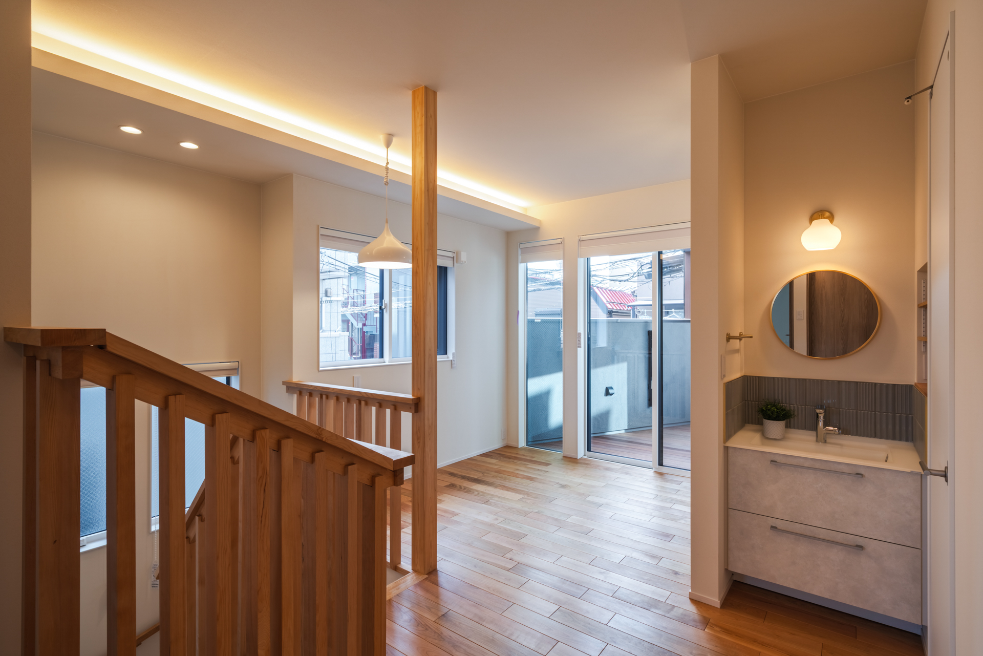 通常よりも天井高を意識して設計した物件です。 セカンドリビングや、スキップフロアを作り家族の居場所を増やしています。 リビング入り口の大きな造作の引き戸もポイントのひとつです。
