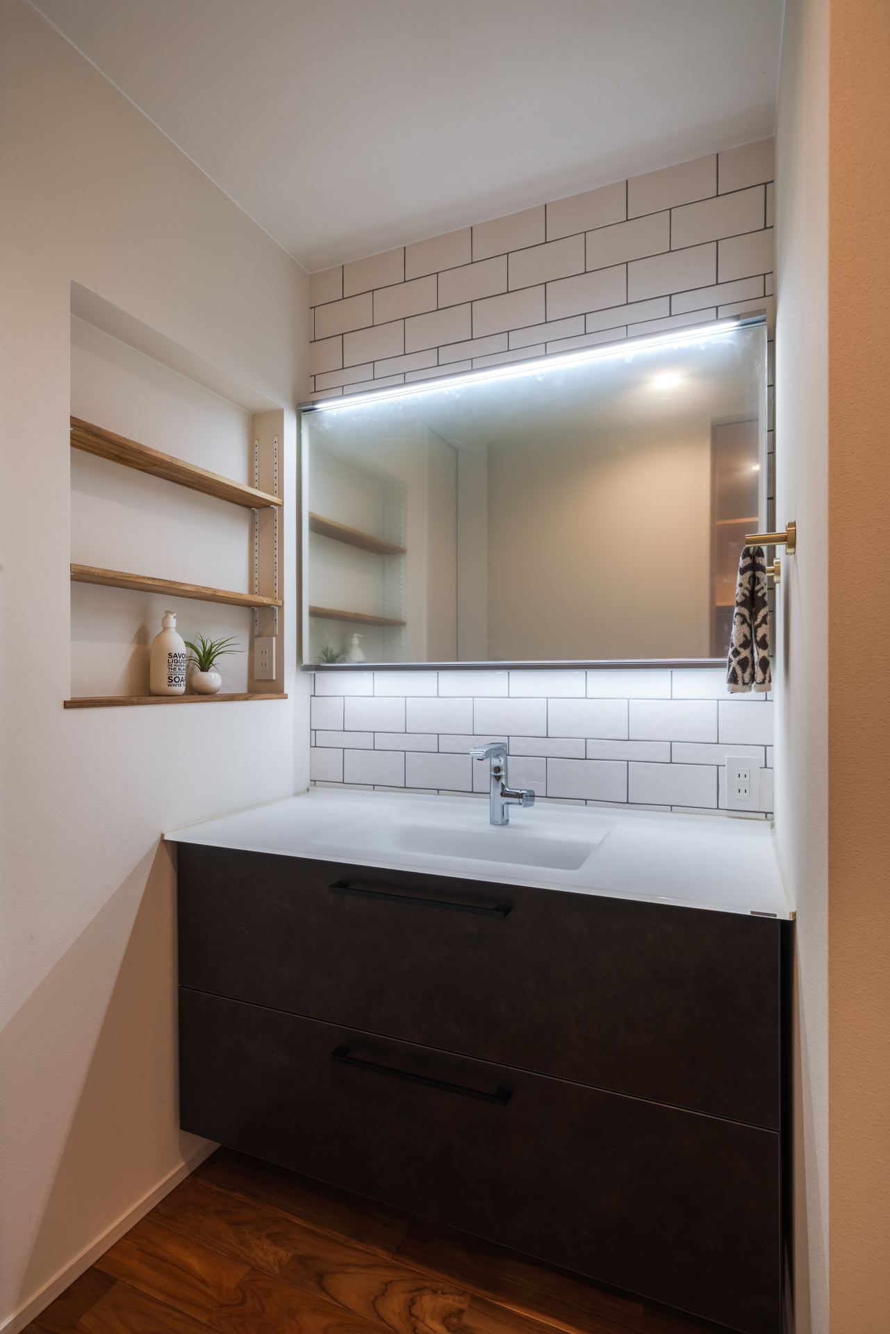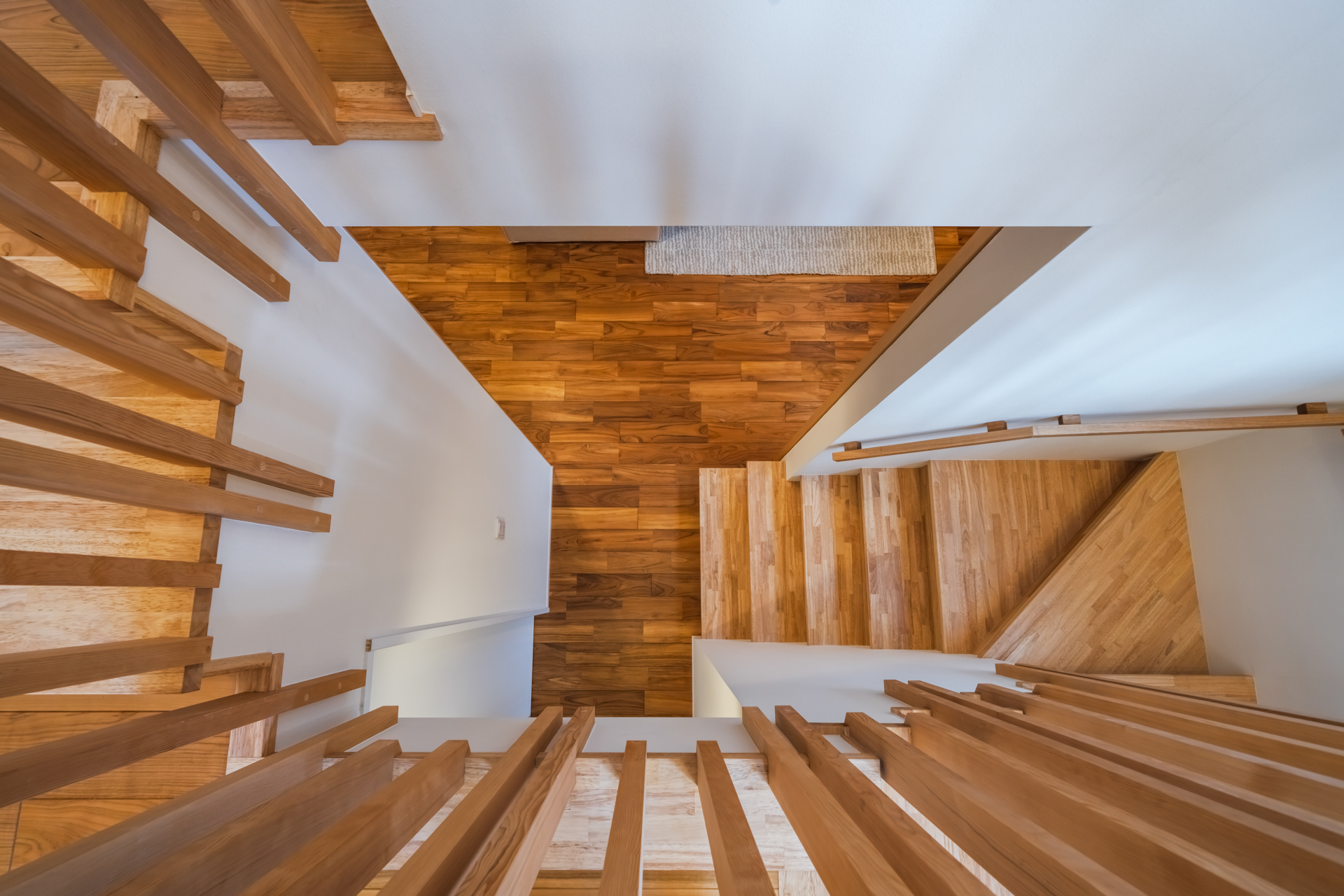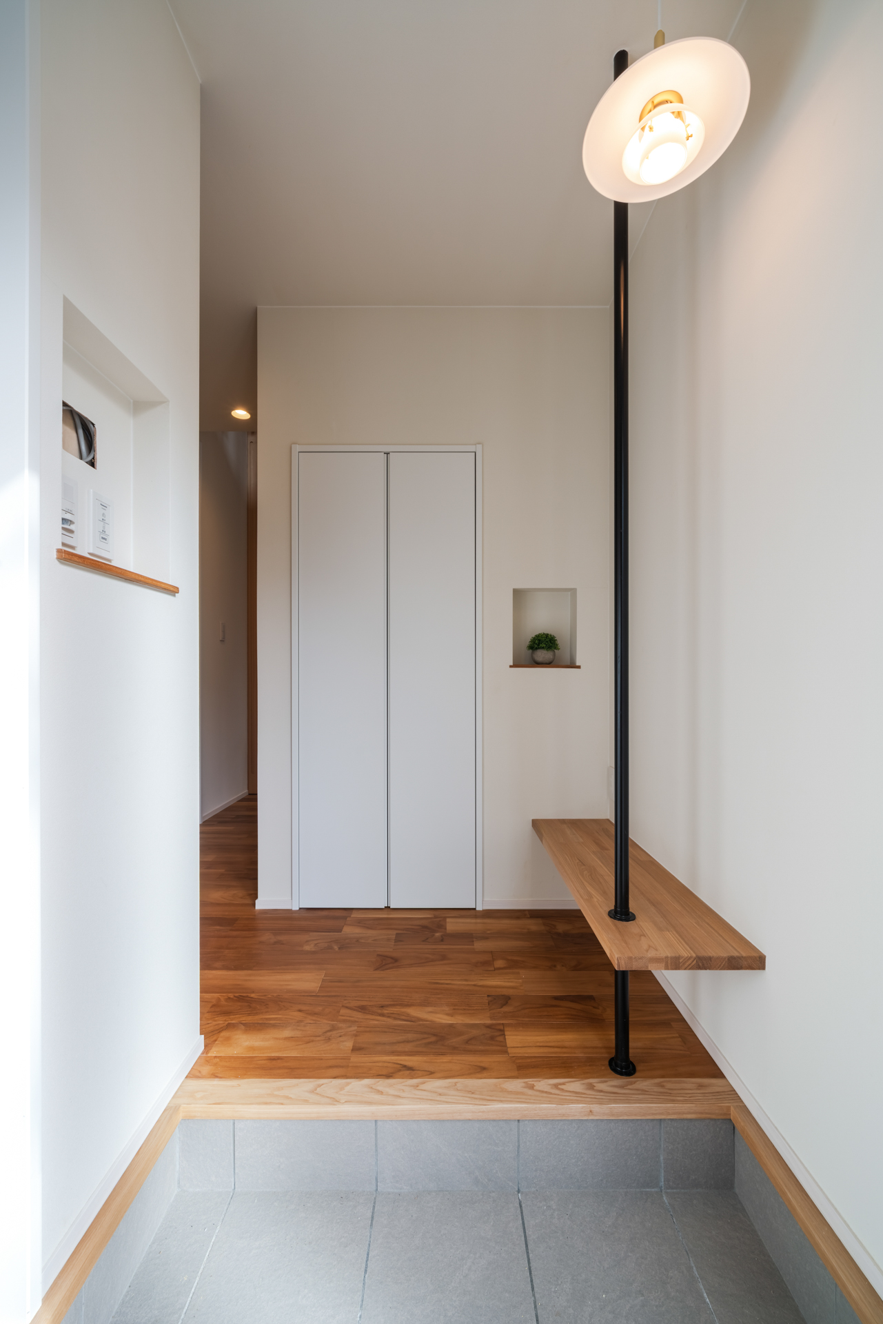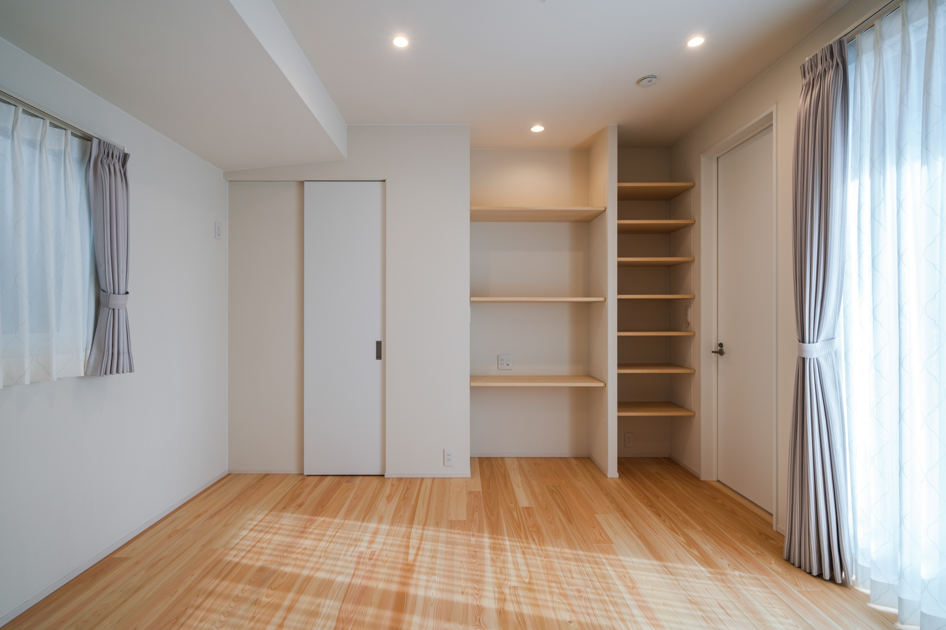 通常よりも天井高を意識して設計した物件です。 セカンドリビングや、スキップフロアを作り家族の居場所を増やしています。 リビング入り口の大きな造作の引き戸もポイントのひとつです。