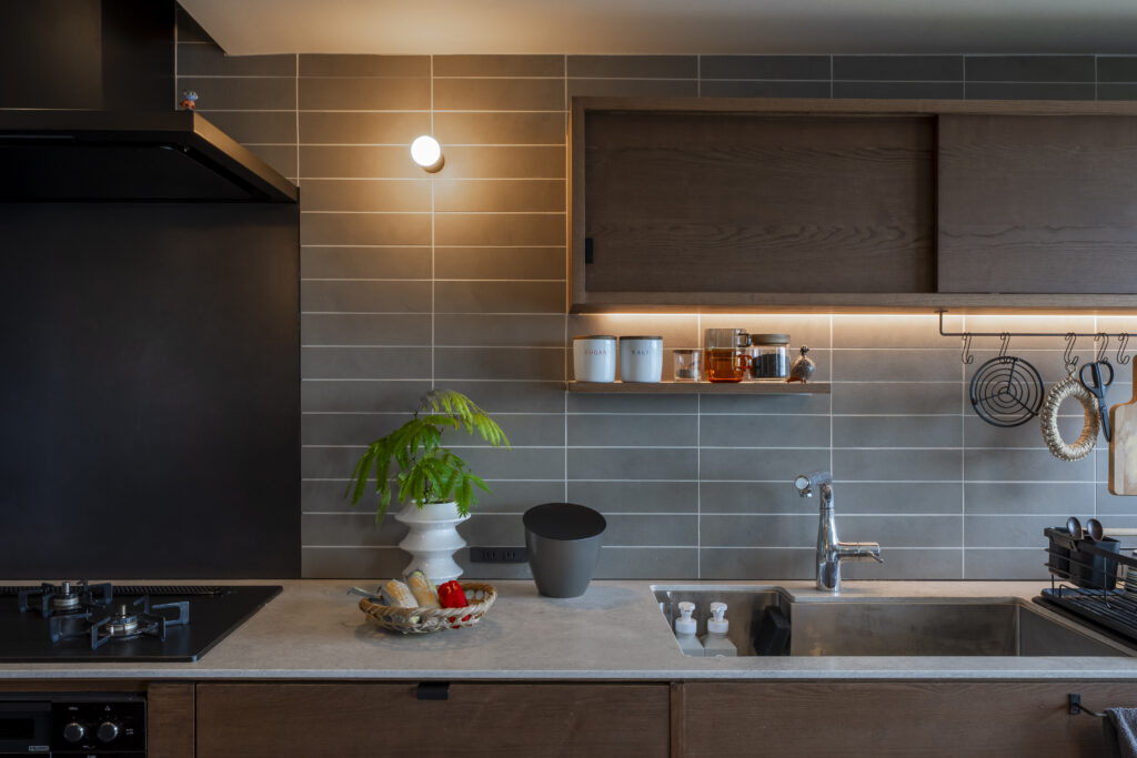 モルタル風の塗り壁と間接照明でデザイン性を高めつつ、トースターやケトルを置いてもまだスペースにゆとりがあるので、お盆を置いてそのまま配膳することができるのが便利です。