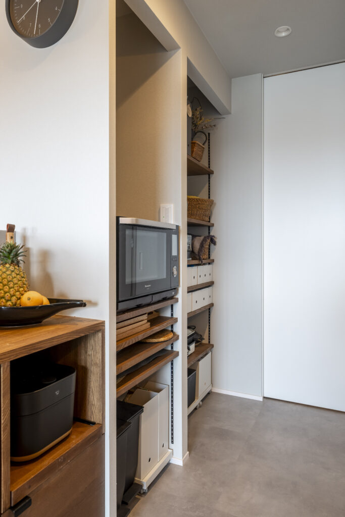 しかし高さが合わなかったため、電子レンジは隣の収納棚に置くことにしました。